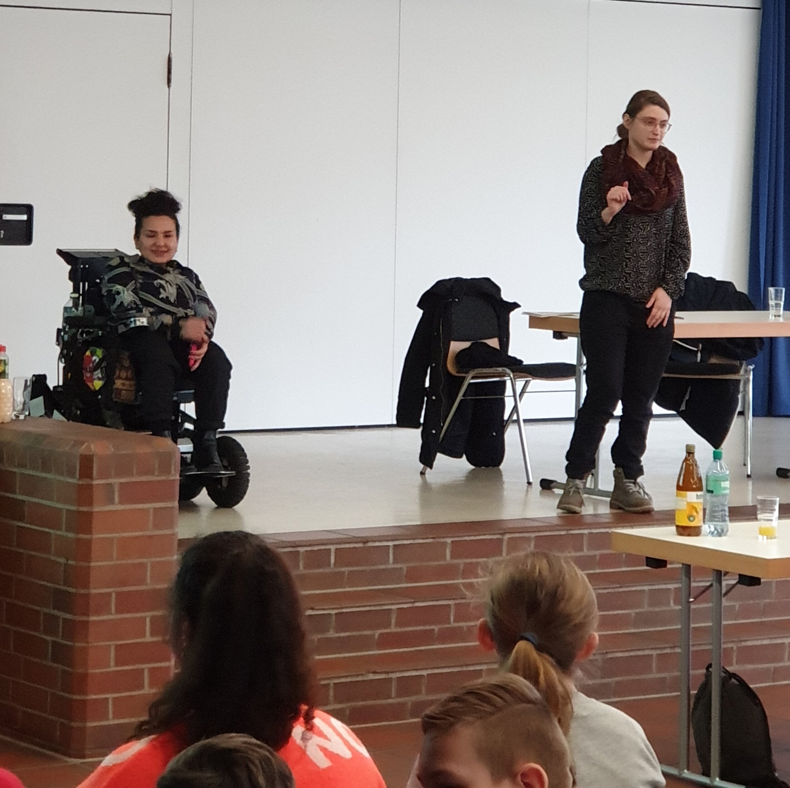 Um 8.45 Uhr treffen die beiden Referentinnen ein: Kübra, 29 Jahre alt, hat Glasknochen und sitzt im Rollstuhl. Clara, 24 Jahre alt, ist gehörlos. Beide arbeiten neben ihren eigentlichen Jobs bzw. dem Studium als Moderatorinnen für Aktion Mensch und machen durchschnittlich 3-4 Mal im Monat solche Kinder- und Jugendworkshops. Na gut, zwischen dem Durchschnittsalter der Zuhörerschaft von 14 Jahren und den beiden Moderatorinnen gibt es doch eine nicht unwesentliche Lücke von mindestens 10 Jahren, weswegen Peer-to-Peer Ansatz nicht ganz stimmt.